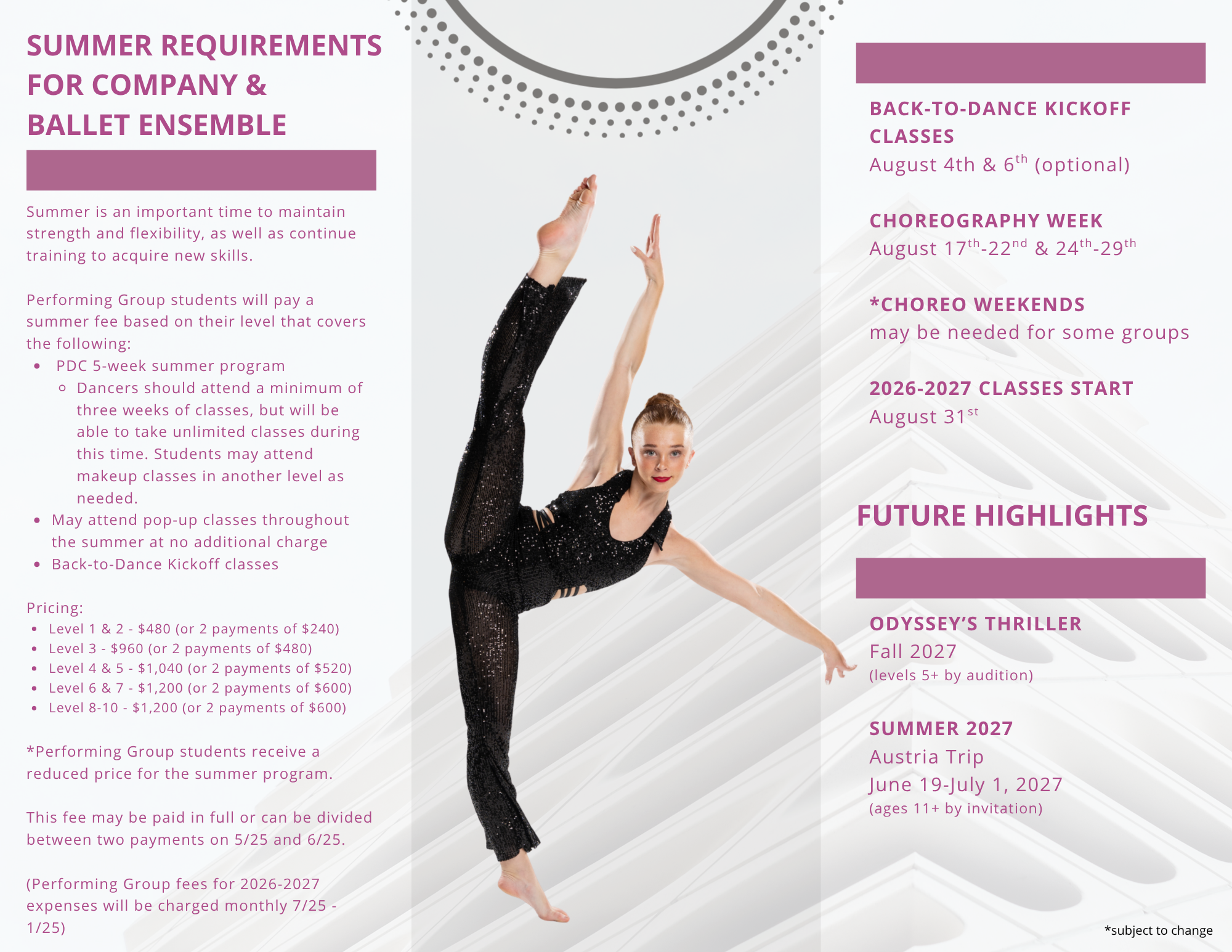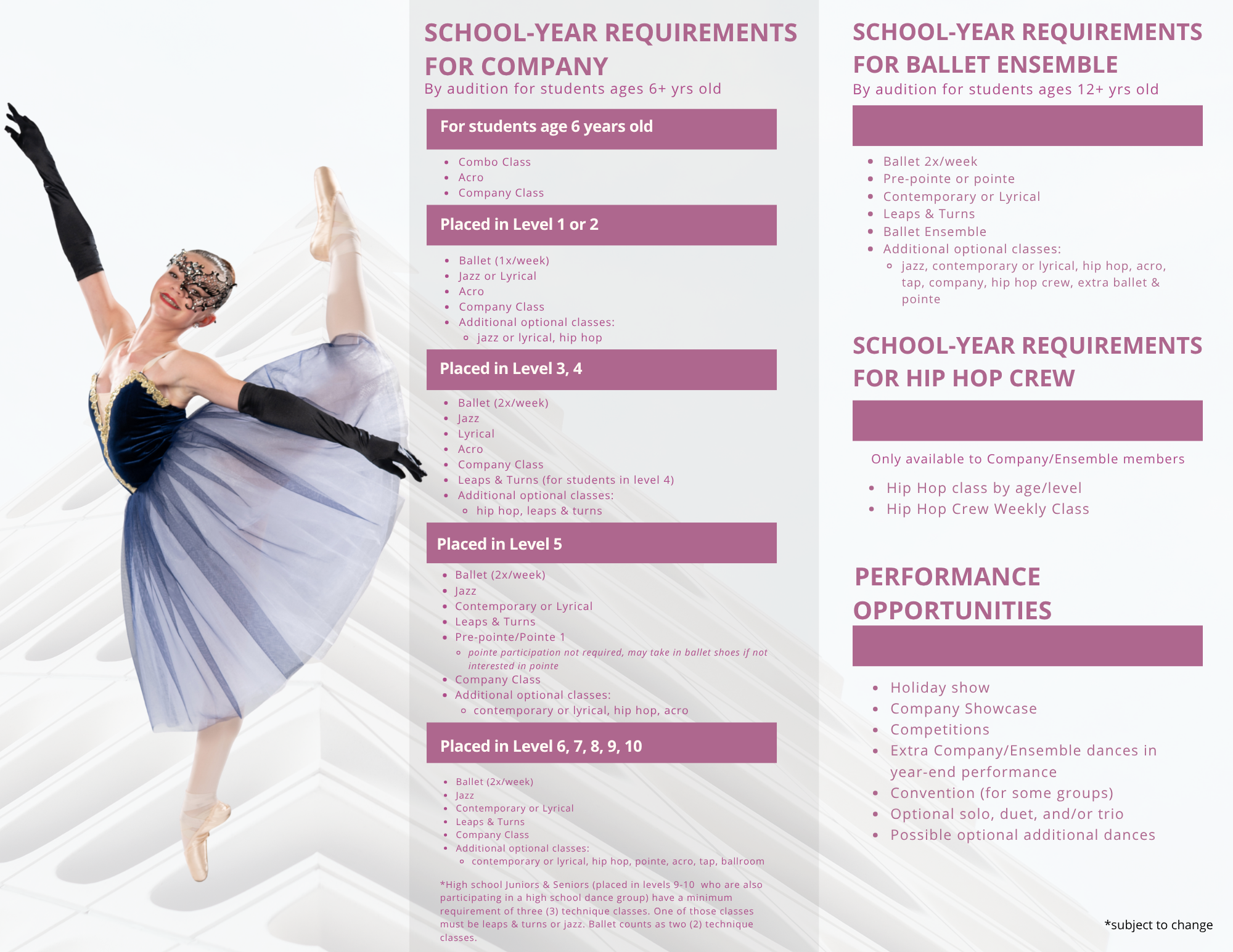 Performing Groups give dedicated students the opportunity to perform several times throughout the year at special events and competitions. Students interested should be highly motivated and ready to commit to an exciting year of dance! The Companies' main focus is jazz, lyrical, and contemporary. Ballet Ensembles focus on classical and contemporary ballet. Each group requires registration in technique classes based on age and level of dancer.